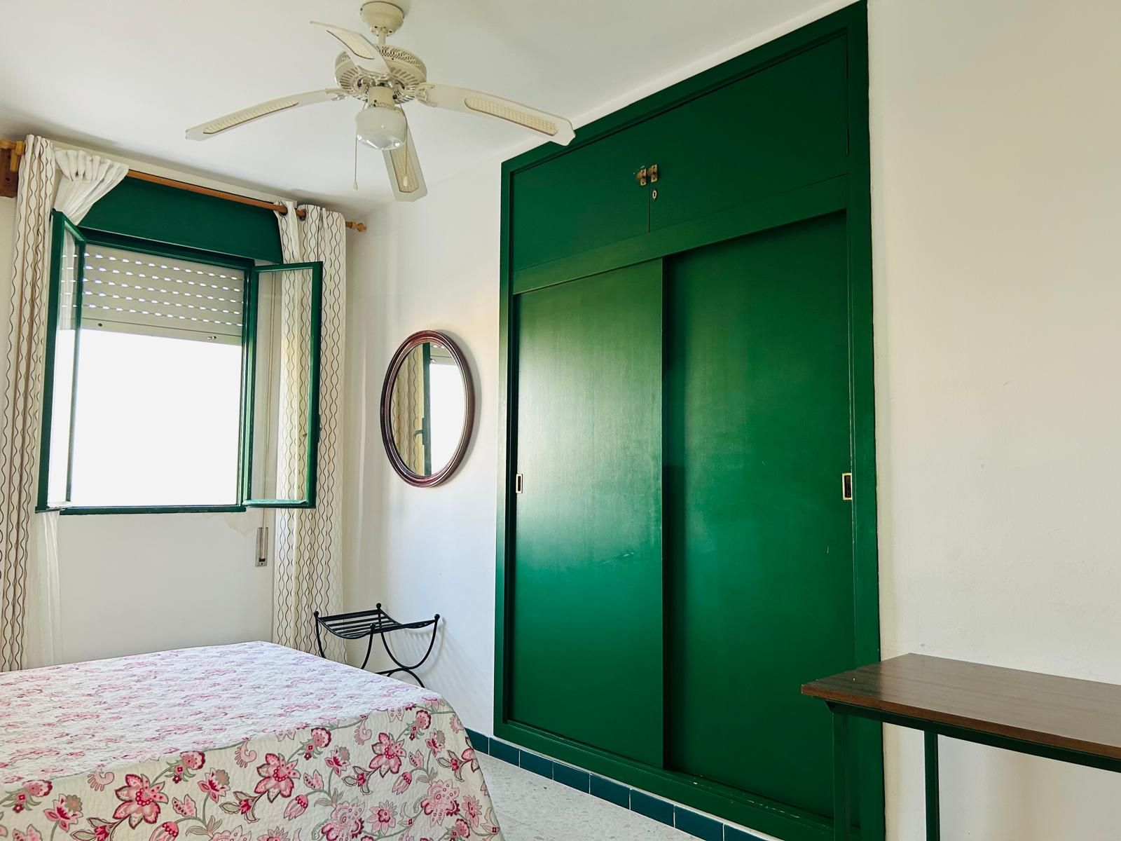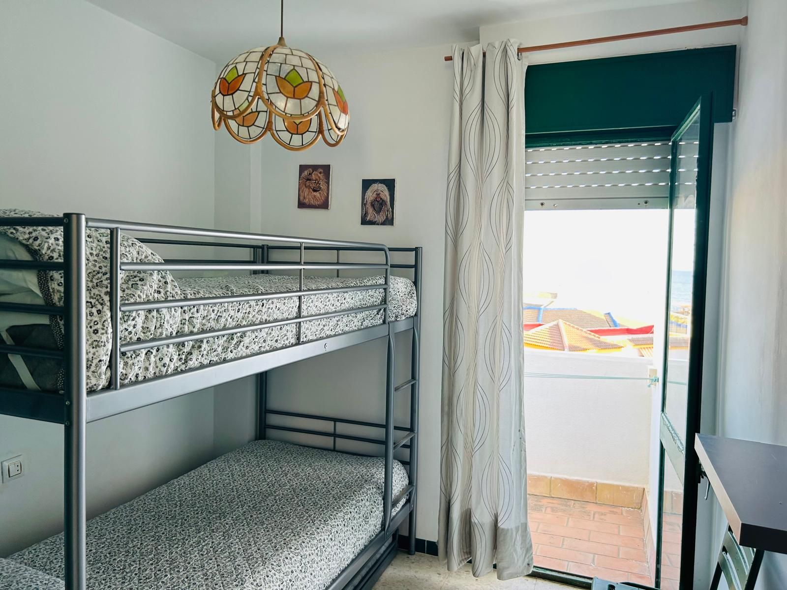 En la planta superior se sitúan dos habitaciones y un baño completo. El dormitorio de invitados dispone de armario empotrado, litera y balcón privado, ideal para disfrutar del aire fresco y las vistas. El dormitorio principal cuenta con ventilador de techo, armario empotrado y ventana con vistas al mar.